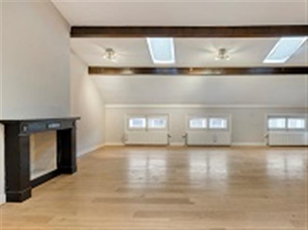 Entree; trap naar de 2e (bovenste) verdieping. Grote L-vormige woon-/eetkamer met prachtige marmeren schouw en dakramen; open keuken voorzien van wasmachine, combi-oven/magnetron en trendy retro Smeg koelkast/vriezer; ruime slaapkamer met enorme ramen en een groot aangrenzend terras met middag-/avondzon; moderne badkamer met inloopdouche, wastafel in badmeubel, handdoekradiator; apart toilet.