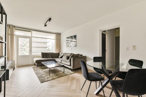 De ruime woonkamer bevindt zich aan de achterzijde van het appartement en biedt via openslaande deuren toegang tot het balkon. Ook aan de achterzijde bevindt zich de slaapkamer, met voldoende kastruimte en een tweepersoonsbed.