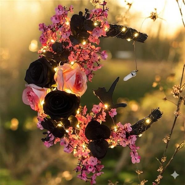 Magie en stijl aan je voordeur met deze unieke halve maan krans . De krans is zorgvuldig handgemaakt van houten twijgjes en gedecoreerd met zwart-roze bloemen , subtiele takjes en een elegante zwarte kat-silhouet voor een mystieke uitstraling.