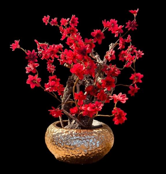 Deze rode kunst bloesem is verwerkt op echt hout. Houten boomstam vertakkingen zijn de basis. Hout is behandeld en de basis is een ronde houten voet die makkelijk op maat te zagen is als die eventueel niet helemaal in uw eigen pot past.
