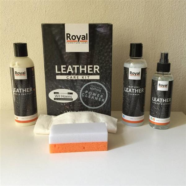 Leather care kit met power cleaner Universele verzorgingsset voor het onderhouden, beschermen en reinigen van vele soorten leder. Complete set voor onderhoud, bescherming en reiniging. De set bevat een flesje kleurloze Leather protector, een flesje Leather cleaner en een power cleaner en een spons .