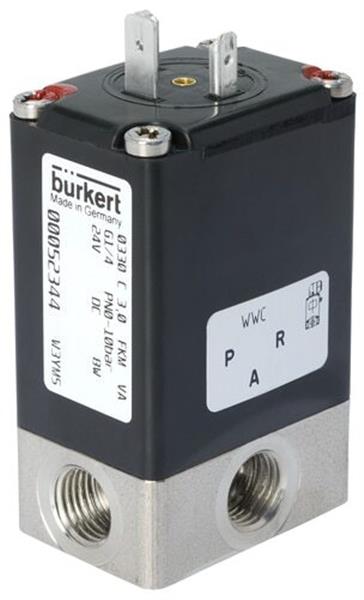 Burkert 3/2-weg magneetventiel (type 0330) met G 1/4 inch schroefdraad en een 24 V DC spoel. De klep schakelt tussen twee inlaatpoorten naar de uitlaatpoort, afhankelijk van of de klep onder spanning staat of niet. De klep werkt direct, dus er is geen differentiële druk nodig. Geschikt voor licht verontreinigde en agressieve media (mediascheiding). Geschikt voor maximale mediumtemperaturen van 90 °C (194 °F) en een drukbereik van -1 - 5 bar (-15 - 73 psi). Behuizing van RVS met FKM afdichting en een opening van 3 mm. De Kv-waarde bedraagt 0,14 m3/h (2,33 l/min bij dp=1 bar water). Handmatige override. Geschikt voor vacuum.