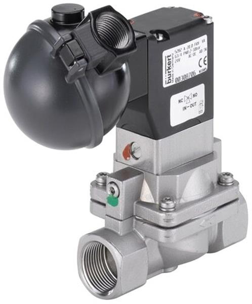 Burkert 2/2 weg magneetventiel (type 5282) met G 3/4 inch schroefdraad en een 110 V AC/DC spoel. De klep kan worden ingesteld op Normaal Gesloten (standaardinstelling) of Normaal Open. De klep werkt indirect, dus er is een klein drukverschil nodig. Geschikt voor licht verontreinigde en agressieve media (mediascheiding). Geschikt voor maximale mediumtemperaturen van 90 °C (194 °F) en een drukbereik van -0.2 - 10 bar (-3 - 145 psi). Behuizing van RVS met EPDM afdichting en een doorlaat van 20 mm. De Kv-waarde bedraagt 6,5 m3/h (108,36 l/min bij dp=1 bar water). Handmatige override. Voorkom waterslag met de instelbare sluittijd. Dit magneetventiel is ATEX- en IECEx-gecertificeerd.