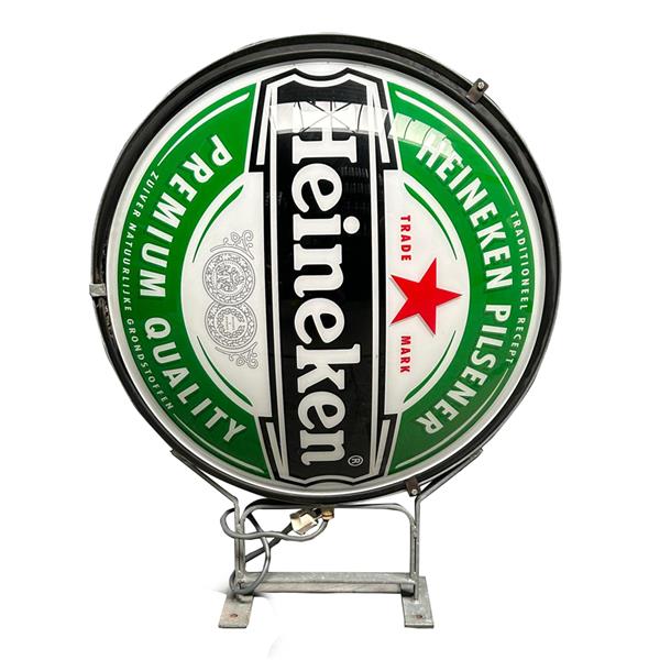 Voeg een krachtig statement toe aan je interieur of collectie met deze indrukwekkende Heineken dubbelzijdige lichtbak. Met een royale diameter van 85 cm en een totale hoogte van 1 meter is dit een zeldzaam groot exemplaar dat direct de aandacht trekt. Het tijdloze ontwerp met het iconische groen-witte logo en de herkenbare rode ster maakt dit tot een ultiem decoratiestuk voor de echte liefhebber.