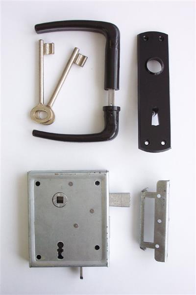 Universeel oplegslot, met zwart deurkrukgarnituur. Geschikt voor naar binnen- en buiten draaiende deuren, rechts- en links bruikbaar.